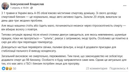 Водночас блогер Владислав Бовсуновський зі свого досвіду написав, що спиртовий бензин – це нормально, якщо на авто активно їздити. Але якщо машина стоїть або їздить мало, починаються нюанси: двигун голосніше працює, реагує з затримкою.