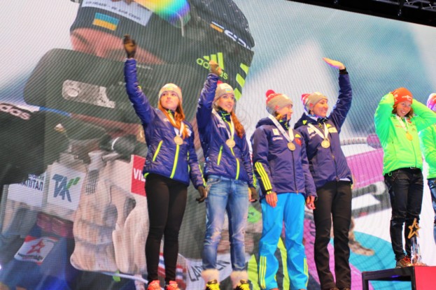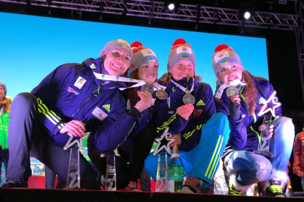 Нарешті на церемонії нагородження, що відбувалася на центральній площі Гохфільцена, було українське свято! Попри чергову перемогу німецької команди, найбільше саме українських прапорів, а українські біатлоністки отримали можливість обливатися шампанським разом з іншими призерками естафети.
