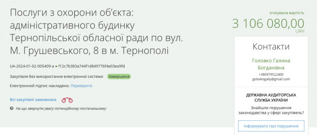 Комунальне підприємство Управління з експлуатації майнового комплексу Тернопільської обласної ради оголосило закупівлю «Послуги з охорони об’єкта: адміністративного будинку Тернопільської обласної ради по вул. М. Грушевського, 8 в м. Тернополі» загальною вартістю 3 106 080,00 грн.