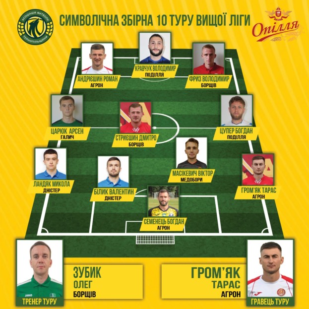 До символічної збірної ввійшли гравці шести команд, які брали участь у десятому турі («Колос» з Бучача, згідно календаря, 10-й тур пропускав).