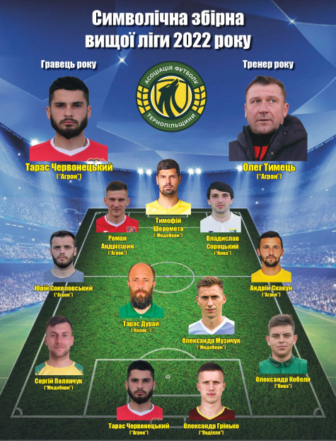 На основі опитування головних тренерів і капітанів команд вищої ліги чемпіонату Тернопільської області 2022 року, а також символічних збірних, які формувалися протягом усього сезону пропонуємо до Вашої уваги символічну збірну вищої ліги 2022 року.