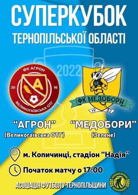 Матч відбудеться завтра, 24 серпня, у Копичинцях. Зустрічатиметься великогаївський «Агрон» та «Медобори» із Зеленого.