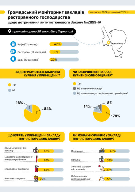 • У 84% закладів ресторанного господарства не було зафіксовано жодної реклами тютюнових виробів, пристроїв для нагрівання тютюну або кальянів. У Тернополі цей показник складає 82%. Натомість порушниками у Тернополі найчастіше була використана реклама через дописи у соціальних мережах про куріння кальянів (33%), табличка IQOS Friendly (33%), постери з кальянами (11%), вітрини з сигаретами або ТВЕН (11%), присутність сигарет, ТВЕН або пристроїв у паперовому або електронному меню (11%).