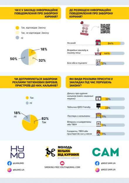 Всеукраїнська кампанія «Молодь вільна від куріння» у партнерстві з Центром громадянського представництва «Життя» представила результати громадського моніторингу 500 кафе, барів та ресторанів у 7 містах: Києві, Львові, Одесі, Дніпрі, Рівному, Вінниці, Тернополі.