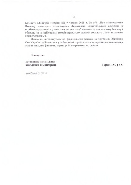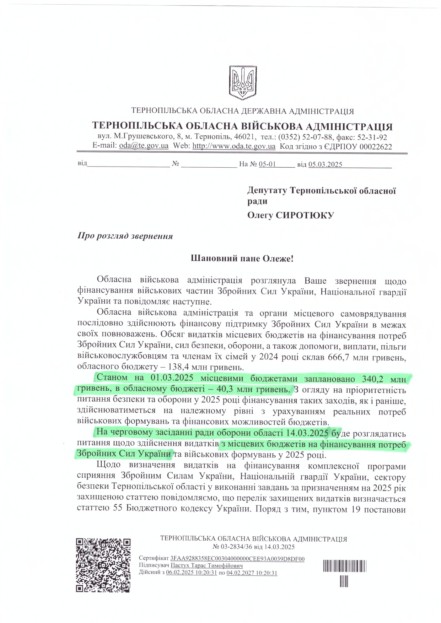 Тернопільська ОВА декларує готовність спрямувати на потреби ЗСУ 40 млн грн з обласного бюджету та інформує про 340 млн грн закладених у бюджетах територіальних громад на потреби військових формувань. Про це йдеться у відповіді заступника голови Тернопільської ОВА Тараса Пастуха на депутатський запит Олега Сиротюка.