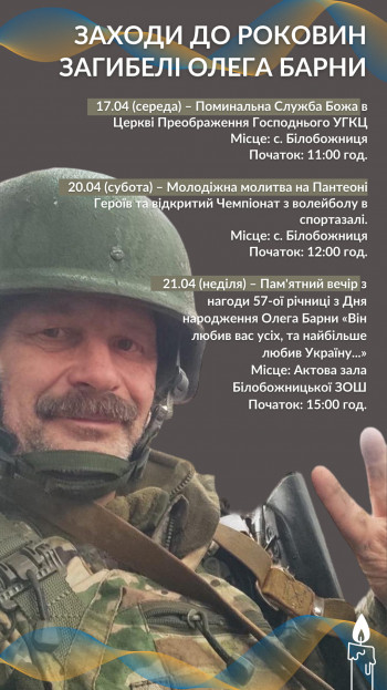 21.04 (неділя) – Пам’ятний вечір з нагоди 57-ої річниці з Дня народження Олега Барни «Він любив вас усіх, та найбільше любив Україну…» Місце: Актова зала Білобожницької ЗОШ. Початок: 15:00 год.
