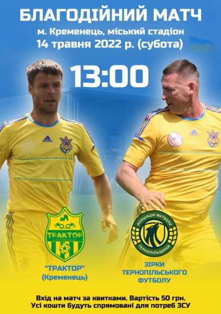 Координаційний центр підтримки Збройних Сил України Асоціації футболу Тернопільщини у суботу, 14 травня, в Кременці організовує благодійний матч між командами зірок тернопільського футболу та кременецьким «Трактором».