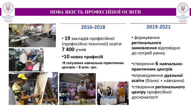 «У 2016-2018 роках говоримо й про нову якість професійної освіти. Адже за результатами капіталовкладень маємо 10 нових професій у професійних училищах та 8 оновлених навчально-практичних центрів», – підкреслює голова ТОДА Степан Барна