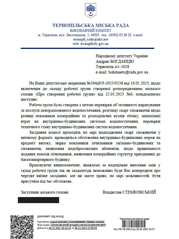 Після депутатського звернення нардепа-мажоритарника з Тернополя Андрія Богданця та розголосу у ЗМІ щодо діяльності КП «Тернопільводоканал» та сумнівних нарахувань за нібито додатково спожиту воду (об’єм якої визначається, як різниця між показниками загальнобудинкового та індивідуальних лічильників) Тернопільська міська рада створила робочу групу для перевірки об’єктивності нарахування за послуги централізованого водопостачання.
