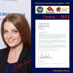 Студенти освітньої програми «Психологія перемовин та медіації» ННІК Західноукраїнського національного університету Євгенія Капалкіна та Євген Ісмаїл пройшли другий відбірковий тур за участю у Школі молодого диплома «The young diplomat school – 2023» у Гаазі (Нідерланди).