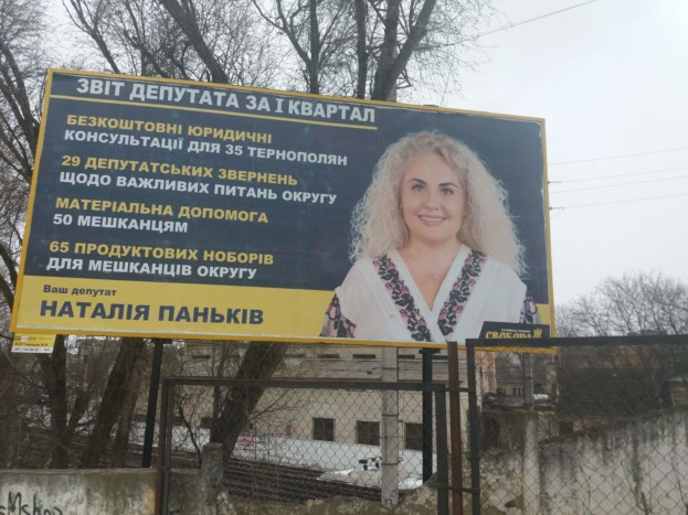 Пані Паньків гордо повідомляє тернополянам, як вона надала 35 безкоштовних юридичних консультації, зробила 29 депутатських звернень щодо важливих питань округу, надала 50 мешканцям Тернополя матеріальну допомогу та 65 жителям округу передала продуктові набори (слово «набори» написано на борді ще й з помилкою – «нобори»).