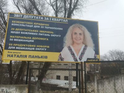 Депутат Тернопільської міської ради з фракції «Свобода» Наталія Паньків вирішила прозвітувати перед своїми виборцями і зробила це доволі помпезно – з біг-бордів. Все було б нічого, якби не один штрих. Звіт вона зробила за перший квартал, який ще не завершений, адже пройшло два повних зимових місяці і кілька березневих днів. А борди з’явилися і того раніше, ще наприкінці лютого.