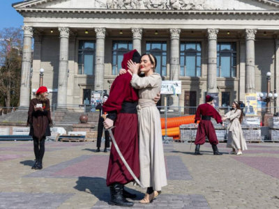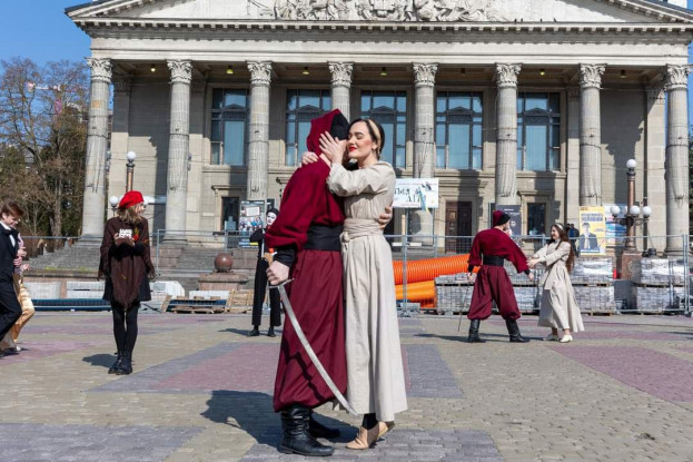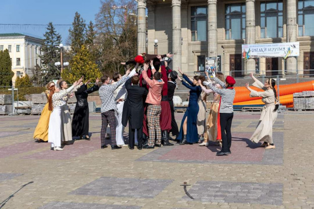 Сьогодні, 16 березня, театральна спільнота Тернопільщини долучилася до мирної акції на знак шани загиблих внаслідок бомбардування театру в Маріуполі. Актори провели перформанс, який показував життя до та після атаки.