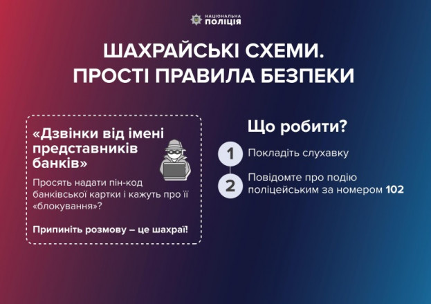 Співробітники поліції вкотре попереджають жителів краю не довіряти телефонним незнайомцям, які розповідають про проблеми з банківськими картками. Будь-які операції з платіжною карткою краще проводити особисто у відділенні банку. За жодних обставин не переказуйте ваші кошти на будь-які інші рахунки та рахунки третіх осіб