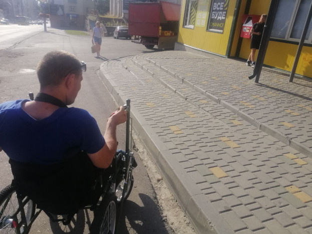 – На пішохідних переходах не всюди є спуски. А спуск з бордюрів і підйом на них – одна з головних проблем для людей на візках. Ось беремо пішохідний перехід біля ЦУМу. З’їхати з бордюру ще можливо, а ось виїхати – немає змоги. Якщо бордюр має висоту до 5 см, то з розгону на нього можу виїхати, а якщо більший – потрібно просити сторонньої допомоги або доводиться об’їжджати по дорозі (це вже само собі є небезпечно через рух транспорту), щоби знайти місце, де можна виїхати на тротуар. Водночас не є проблематично зробити спуски та підйоми з бордюрів на пішохідних переходах, але, повірте, настільки б це полегшало пересування таким людям, як я, – зауважує Віктор Старущак.