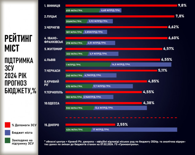 Очолила рейтинг міст обласного значення із найбільшою часткою відрахувань на підтримку ЗСУ Вінниця, яка спрямувала на підтримку захисників майже 10% власного бюджету громади, що в цифровому еквіваленті становить 655 млн. грн. Другу сходинку посів Луцьк. Далі йдуть Чернігів, Івано-Франківськ, Житомир, Львів, Черкаси, Кривий Ріг, на дев’ятому місті Тернопіль, а замикає першу десятку Одеса.