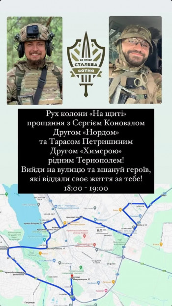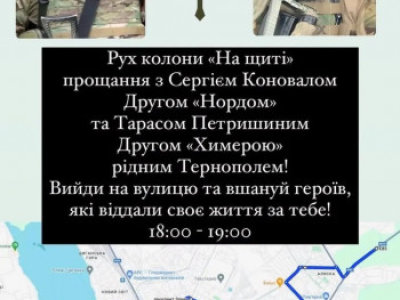 У зв’язку із загибеллю та похованням військовослужбовців Тараса Петришина та Сергія Коновала, які загинули 6 квітня у Донецькій області під час виконання бойового завдання, завтра, 10 квітня на території Тернопільської міської територіальної громади оголошено Днем жалоби. Відповідне розпорядження підписав міський голова Сергій Надал.