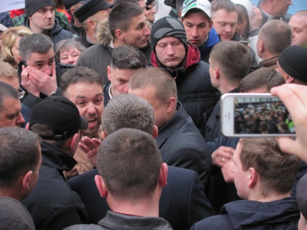 Так на сесію, яка була запланована на десяту ранку понеділка, з’їхалось кілька десятків націоналістів, які вимагали від екс-побратимів скласти повноваження депутатів. Між іншим, «свободівці» вирішили опиратися не лише на партійну риторику у розправі над «тріо», а й заручитися колоритним реквізитом. Близько восьмої ранку під стіни міськради вивантажили три сміттєві баки, іменовані ініціалами екс-«свободівців». Крім цього, в арсеналі протестувальників були також зеленка та сирі яйця.
