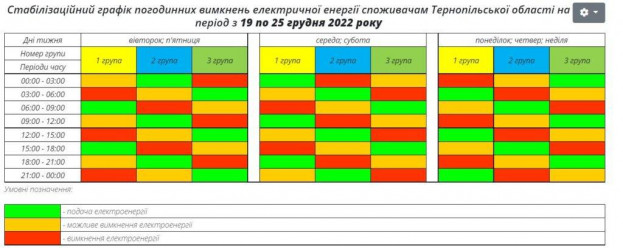 У ВАТ «Тернопільобленерго» оновили стабілізаційний графік погодинних вимкнень електроенергії на тиждень з 19 по 25 грудня 2022 р.