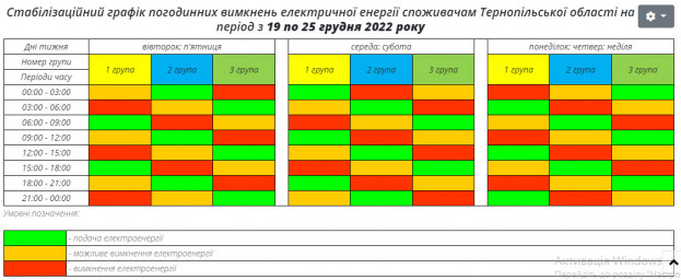 ВАТ «Тернопільобленерго» оприлюднює Стабілізаційний графік погодинних вимкнень електроенергії на тиждень з 19 по 25 грудня 2022 р.