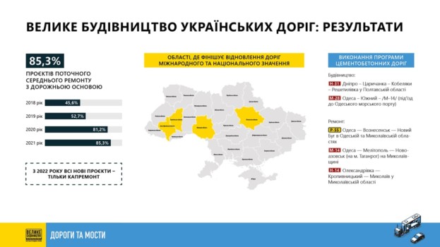 У цьому плані суттєвим досягненням є збільшення частки проєктів поточного середнього ремонту з укріпленою основою до 85,3%. Заміна та укріплення основи наближає технологію виконання поточного середнього ремонту доріг до технології капітальних ремонтів. Відповідно, довговічність відремонтованих доріг значно зростає”, – коментує заступник голови «Укравтодору» Андрій Івко.