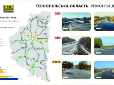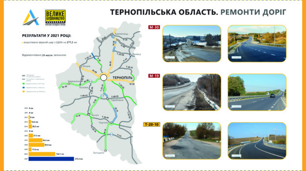 – Відремонтували рекордну кількість штучних споруд. Загалом у рамках «Великого будівництва» відновлюємо 28 мостів. На 24-х із них роботи вже завершено. Це вп’ятеро більше, ніж за всі роки Незалежності разом узяті! На ремонт кожної штучної споруди або проводився окремий тендер, або її відновлення було включено у тендер із ремонту дороги, на якій вона розташована. Знакові завершені об’єкти: міст у Лисівцях на дорозі Р-24 Татарів – Косів – Коломия – Кам’янець Подільський; міст перед селом Городище на дорозі М-30 Стрий – Ізварине; шляхопровід у селі Воля на дорозі М-19 Доманове – Ковель – Чернівці – Тереблече; шляхопровід на об’їзній м. Чорткова (дорога М-19). Це великі мости, які були відремонтовані в 2020-21 рр., – сказав голова Тернопільської ОДА.
