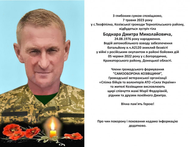Завтра, 7 травня, Козівщина зустрічатиме тіло загиблого вояка Дмитра Боднара, котрий безвісти зник у районі бойових дій на Донеччині ще 5 червня.