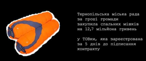 16 листопада Тернопільська міська рада провела закупівлю без тендера очікуваною вартістю у 12 690 000 гривень. На таку суму до Тернополя, начебто, має поїхати 4500 спальних мішків https://prozorro.gov.ua/tender/UA-2022-11-16-009137-a. Термін поставки – до 20 грудня.