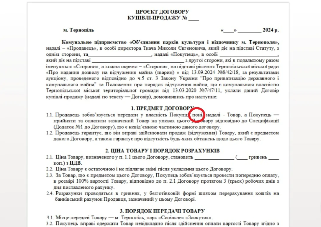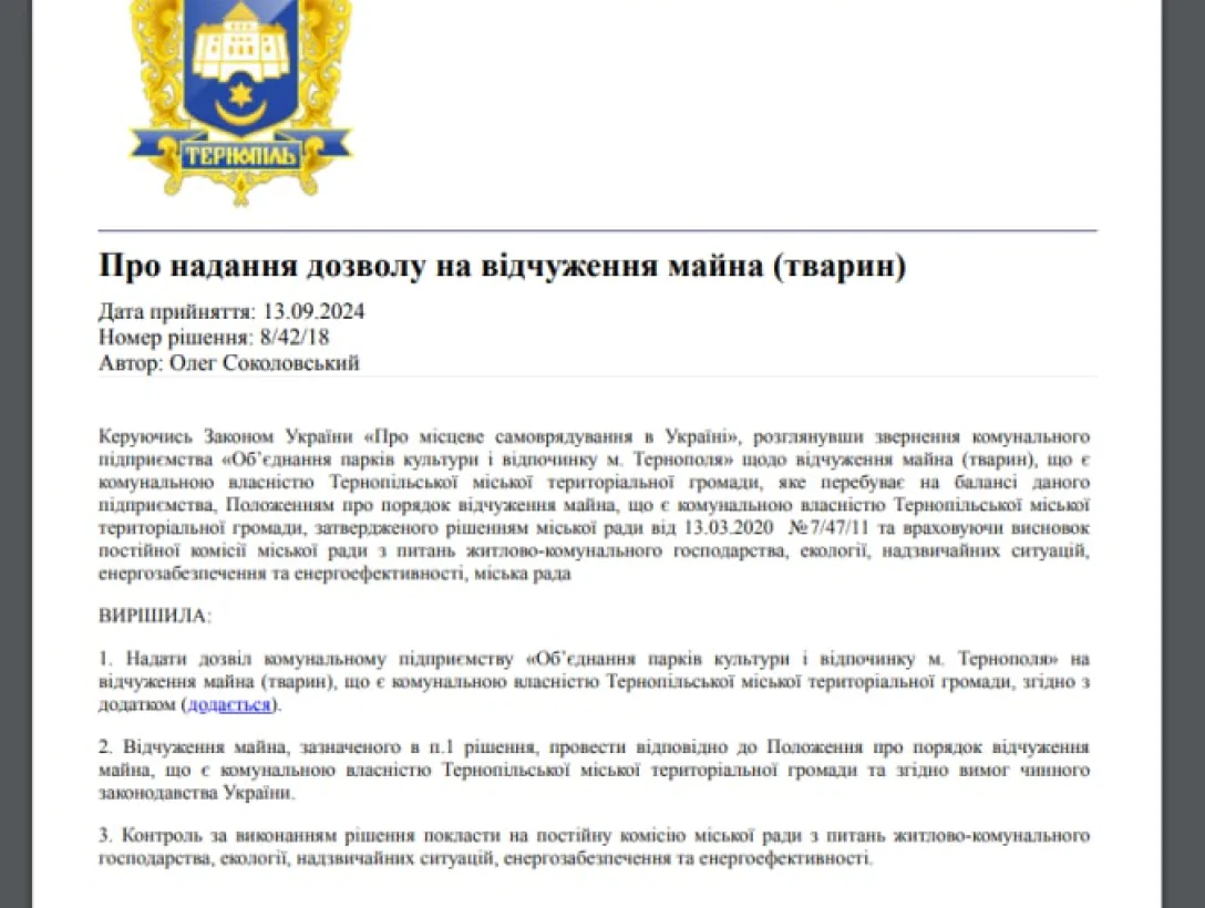 Продають цапа на підставі рішення Тернопільської міської ради “Про надання дозволу на відчуження майна (тварин)”. Власником тварини поки є КП “Об’єднання парків культури і відпочинку м. Тернополя”.