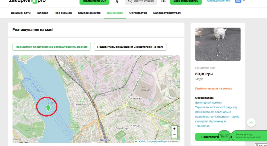 Виконавчий комітет Тернопільської міської ради від імені якого діє КП “Об’єднання парків культури і відпочинку м. Тернополя” виставив на аукціон цапа. Стартова ціна за “лот” 60 гривень. Інформація про продаж тварини з’явилася на сайті zakupivli.pro.