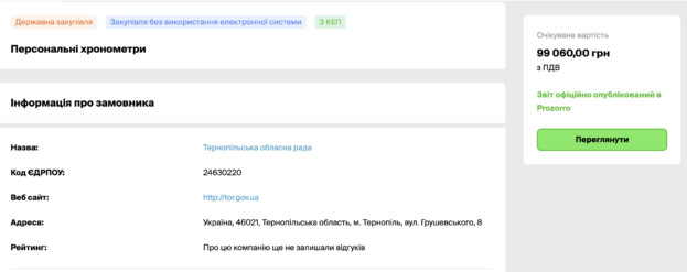 Тернопільська обласна рада витратила 99 060 грн бюджетних коштів на покупку ручних нагородних годинників. Про це повідомляє майданчик державних закупівель “Прозорро”.