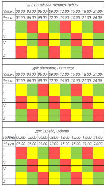 Даний графік, як і попередні, передбачає черговість вимкнення 6 через 3 години або 3 через 6 годин. Тобто, виходячи із погодинного навантаження на енергосистему, енергетики будуть корегувати це навантаження, вмикаючи або вимикаючи певну групу споживачів.