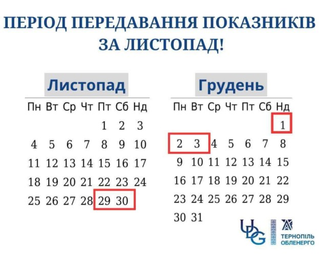 В АТ “Тернопільобленерго” нагадують споживачам, що сьогодні, 29 листопада, розпочався період передавання показників за листопад.