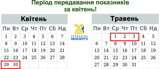 В АТ “Тернопільобленерго” нагадують споживачам, що розпочинається період передавання показників за квітень. Період передавання показників електролічильників за квітень – з 29 квітня по 3 травня включно.