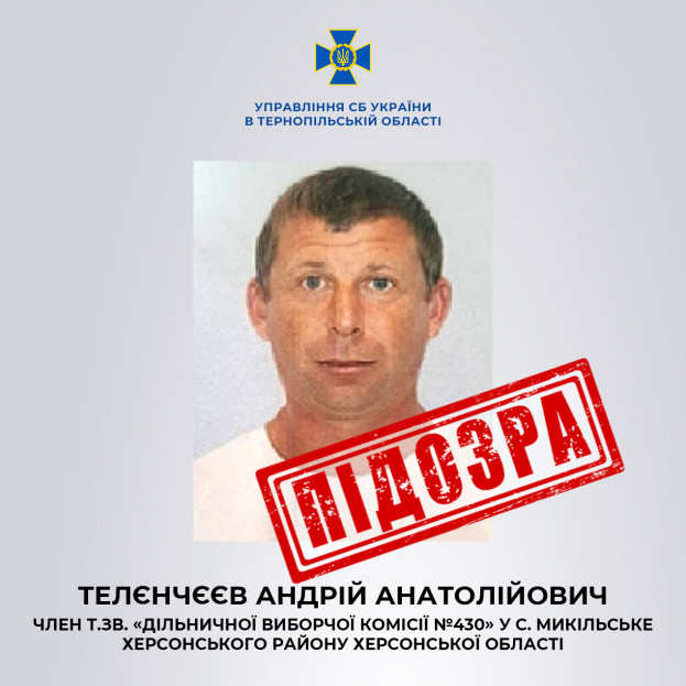 Під процесуальним керівництвом прокурорів Тернопільської обласної прокуратури заочно повідомлено про підозру громадянина України, жителя с. Микільське Херсонського району у добровільній участі в організації та проведенні незаконного референдуму на тимчасово окупованій території України (ч. 5 ст. 111-1 КК України).
