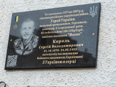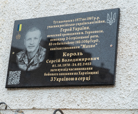 У Тернополі на фасаді навчально-виховного комплексу «Загальноосвітня школа І-III ступенів-економічний ліцей №9 імені Іванни Блажкевич» відкрили меморіальну таблицю Герою України капітану Сергію Королю. Про це повідомив начальник служби зв’язків з громадськістю у 105 окрема бригада територіальної оборони ЗСУ Юрій Кульпа.