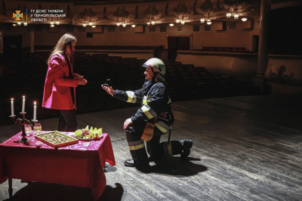 Тернопільський рятувальник оригінально освідчився своїй коханій Ользі, співробітниці однієї з банківських установ міста. В цьому йому допомогли друзі, повідомляє Головне управління ДСНС України у Тернопільській області.