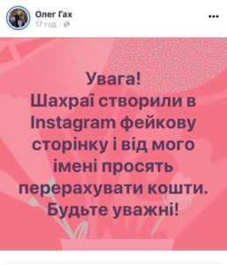 «Від мого імені просять перерахувати кошти. Будьте уважні!», – зазначив Олег Гах на своїй сторінці в мережі Фейсбук.