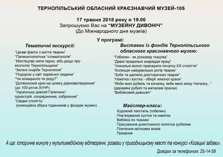 Тернопільський обласний краєзнавчий музей до Міжнародного дня музеїв, який відзначається 18 травня, влаштовує акцію під назвою «Музейна дивоніч».