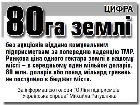 – За законодавством усі земельні ділянки повинні передаватися в оренду чи продаж на конкурсних умовах. У Тернополі, на жаль, практично жодна земельна ділянка не була надана в оренду чи продана на аукціоні. Наш міський голова і, напевно, пан Кібляр придумали цікаву схему. За так званими «інвестиційними угодами» передають землю комунальним підприємствам, а ті за якісь дрібні роботи віддають її приватникам. Звичайно, решта суми – хабарі і це всім зрозуміло. На жаль, правоохоронні органи на це не звертають уваги.