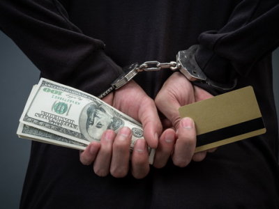 Thief wearing a black hat, obscuring the face, was arrested on a gray background.