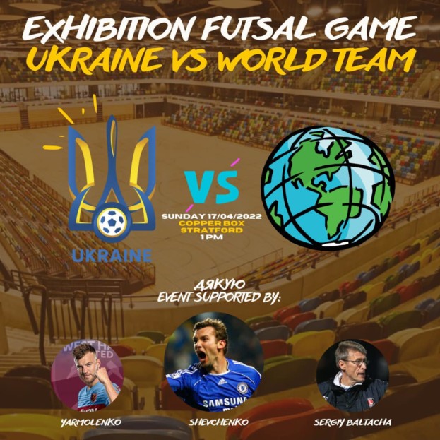 В неділю, 17 квітня, в Олімпійському залі Лондона (Великобританія) – «Copperbox Arena», починаючи з 13 години відбуватиметься благодійна гра з міні-футболу (футзалу) між любительськими командами – збірною України та збірною світу. Організатором матчу виступив корінний тернополянин Олександр Салій, котрий понад 20 років мешкає в Англії.