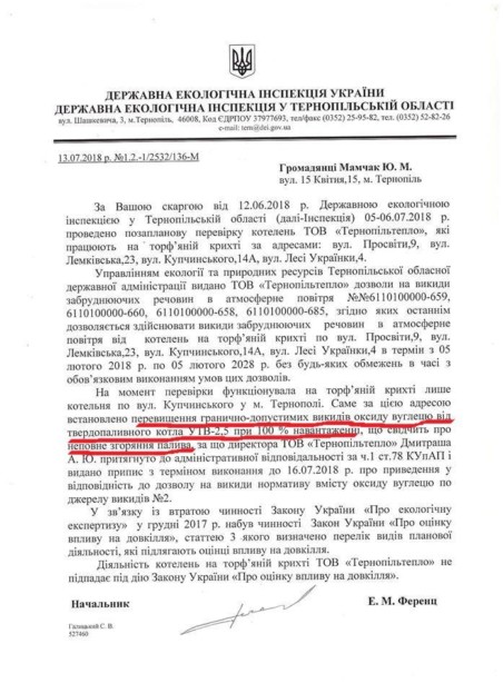 Громадська активістка Юлія Мамчак звернулася зі скаргою до Державної екологічної інспекції у Тернопільській області стосовно діяльності торф’яних котелень. Позапланова перевірка інспекції встановила, що на момент проведення перевірки працювала лише котельня за адресою вул. Купчинського. Нею було встановлено перевищення гранично допустимих викидів оксиду вуглецю.