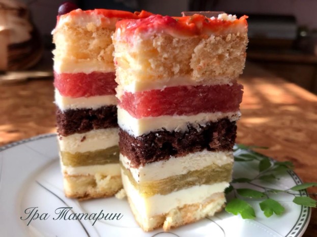Бісквіт змащуємо однією частиною крему, зверху викладаємо яблука з зеленим желе, розрівнюємо, змащуємо частиною крему. Кладемо коричневий бісквіт, змащуємо кремом, яблука з вишневим желе, змащуємо рештою крему, накриваємо рожевим бісквітом.