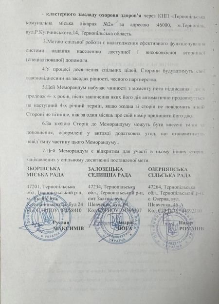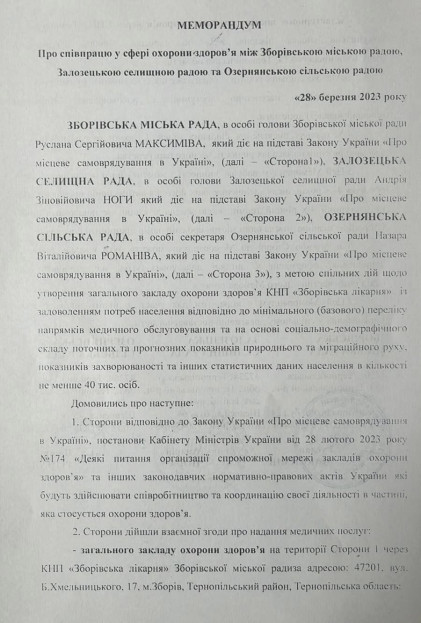 28 березня 2023 року Зборівською, Залозецькою та Озерянською громадами підписано Меморандум «Про співпрацю у сфері охорони здоров’я» з метою збереження та утворення загального закладу охорони здоров’я на базі Зборівської лікарні та входження у кластерну лікарню міста Тернополя.