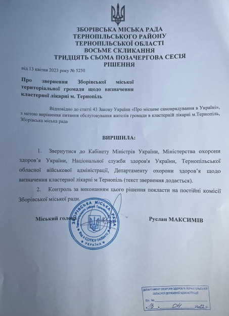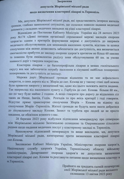 – З невідомих причин та без узгоджень із громадами Зборова, Залізців та Озерної, департамент охорони здоров’я ТОДА має на меті приєднати наші заклади до кластерної лікарні смт. Козова. Тому в терміновому порядку скликано засідання сесії ТГ та прийнято звернення в Кабінет Міністрів України, Міністерство охорони здоров’я України, Національну службу здоров’я України, Тернопільській обласній військовій адміністрації та Департаменту охорони здоров’я Тернопільської ОДА щодо входження до Тернопільської кластерної лікарні, – заявив міський голова Зборова Руслан Максимів.