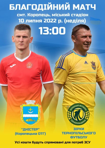 У неділю, 10 липня, Координаційний центр підтримки Збройних Сил України Асоціації футболу Тернопільщини організовує черговий з серії благодійних матчів команди зірок тернопільського футболу. Цього разу наші зірки проведуть поєдинок Коропці, де в суперниках буде коропецький «Дністер».