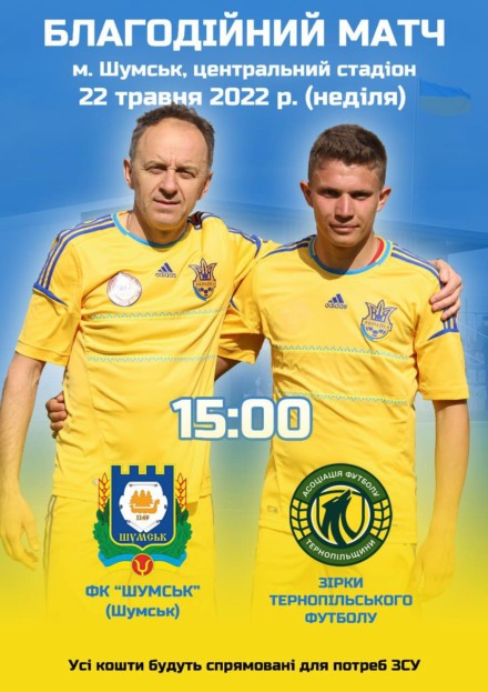 У неділю, 22 травня, Координаційний центр підтримки Збройних Сил України Асоціації футболу Тернопільщини організовує черговий з серії благодійних матчів команди зірок тернопільського футболу. Цього разу суперником буде ФК «Шумськ».