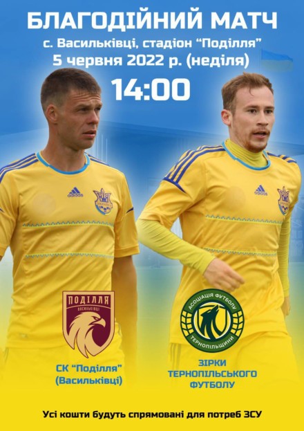 У неділю, 5 червня, Координаційний центр підтримки Збройних Сил України Асоціації футболу Тернопільщини організовує черговий з серії благодійних матчів команди зірок тернопільського футболу. Цього разу наші зірки проведуть поєдинок з «Поділля» з Васильківців.