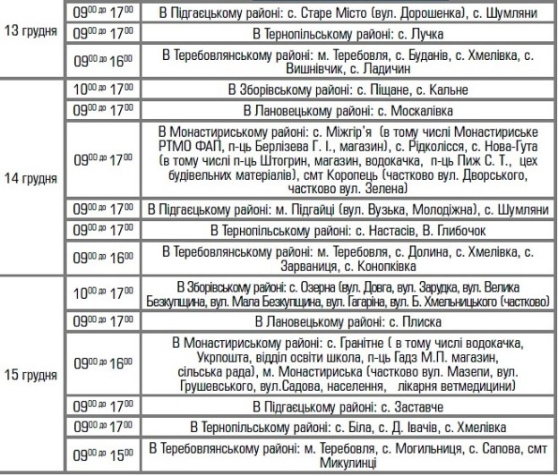 ВАТ “Тернопільобленерго” повідомляє, що у зв’язку з виконанням робіт із планових ремонтів обладнання трансформаторних підстанцій напругою 10/0,4 кВ і ліній електропередавання напругою 10 і 0,4 кВ з розчищенням їх трас та інших робіт з експлуатаційного обслуговування, буде тимчасово припинено постачання електричної енергії окремим споживачам у таких населених пунктах області: